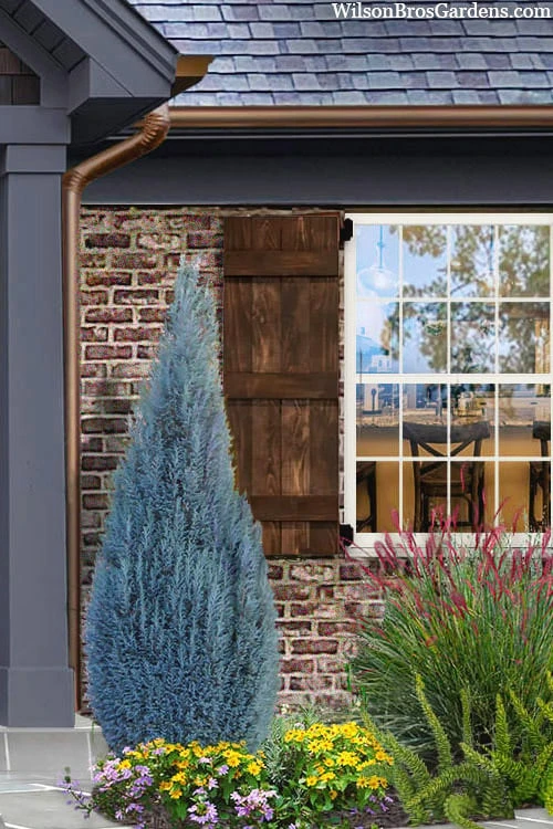 Certain to be an eye pleaser, the Blue Surprise Lawson Cypress forms an upright narrow spire of impeccable, intense steel blue foliage that will not go unnoticed in the landscape! Attractive year round, the dense foliage emerges a silvery blue transition to a darker grey blue in summer then taking on a purplish cast during the colder winter months. Adding maybe 6 inches in height per year and reaching maybe 6 to 8 feet tall and 2 to 3 feet wide at the base when all grown up, Blue Surprise is a perfect fit for smaller garden spaces or to fill a narrow spot. It puts an exclamation point on any garden or home foundation planting. Excellent in rock gardens. Groupings of three are excellent where space allows or two can be used to frame an entrance. No pruning necessary.